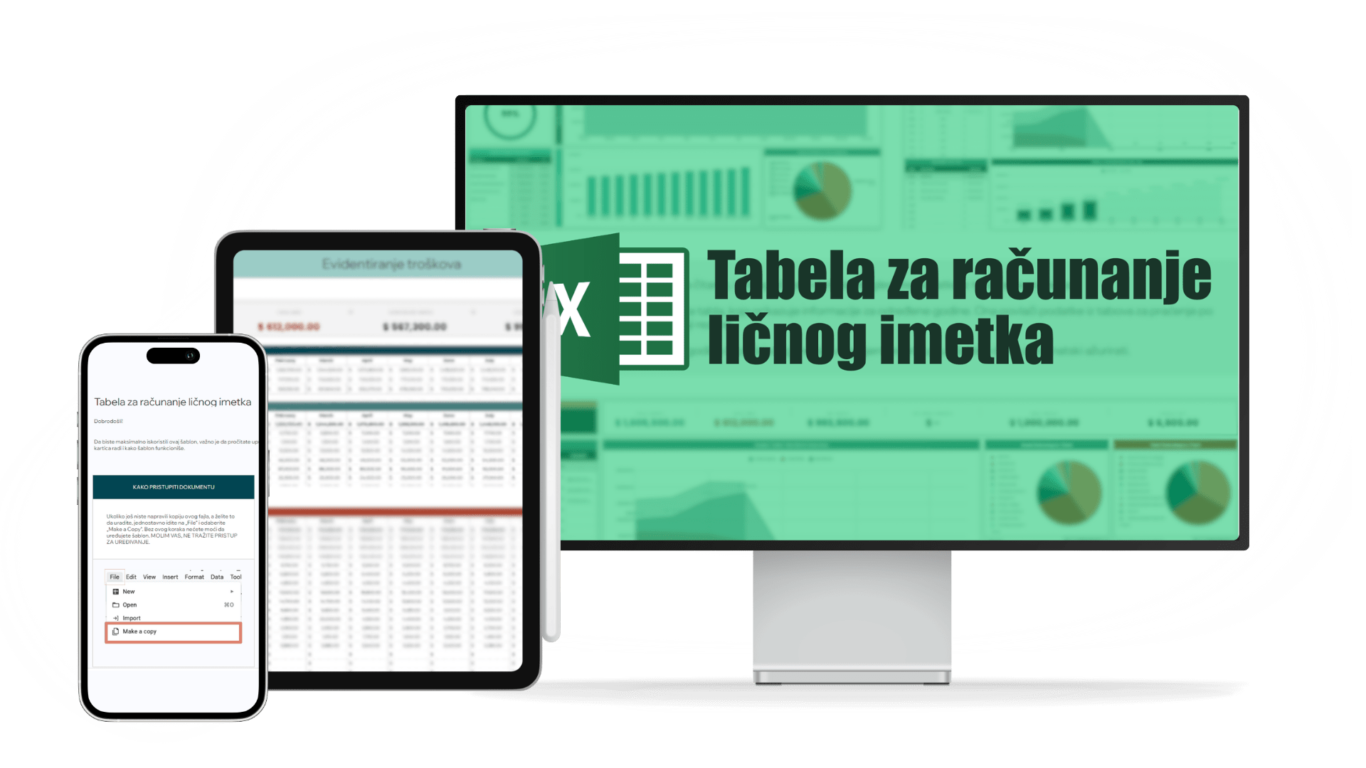 Nema više ručnog računanja. Tabela sama izračunava tvoj neto imetak (imovina – dugovi) i odmah prikazuje koliko si “u plusu” ili “u minusu”.